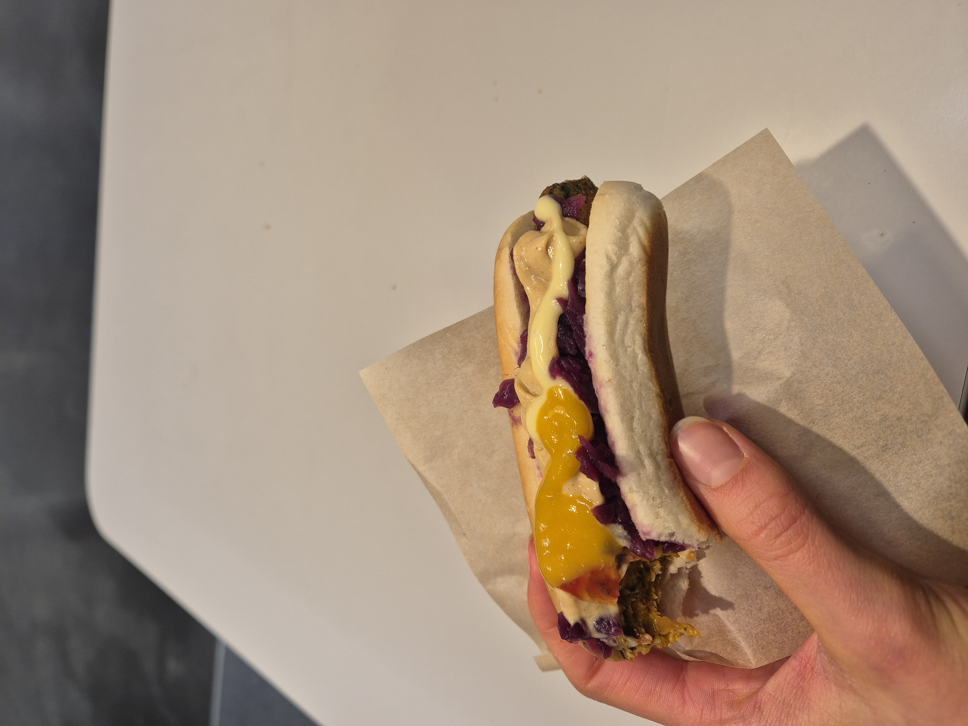 Die Korvmoj, die vegetarische Variante des Hotdogs, überzeugte mit ihren Linsen (wichtige Proteinquelle, haha) und für drei Kronen mehr konnte ich sogar Toppings wählen. Im Gegensatz zu Deutschland kosten diese hier extra, aber die Soßen gab es kostenlos dazu. So viel man ins Brötchen und auf das Würstchen packen konnte, war möglich. Mit den vier Soßen kreierte ich einen wunderschönen Farbverlauf auf meinen Hotdogs. Und was soll ich sagen – es war ein Drei-Gänge-Menü für 2,36€ (und das in Norwegen!). Die Zimtschnecke als Dessert war fluffig, zimtig, mega warm und rettet jede miese Stimmung. 😉
