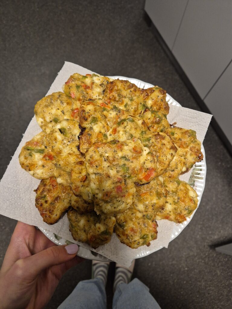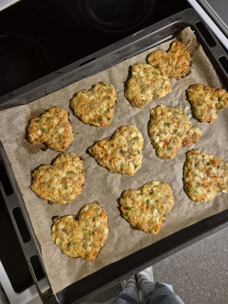 Ein weiteres kleines Problem bestand darin, mich für ein Gericht zu entscheiden. Zunächst hatte ich überlegt, meine wundervollen Quarkbrötchen zu backen. Doch dann fiel mir ein, dass ich hier noch nirgends Quark gesehen hatte – wohl aber Hüttenkäse. Also entschied ich mich kurzerhand, kleine Hüttenkäsetaler zuzubereiten. Und weil eine runde Form natürlich langweilig gewesen wäre, nahm ich mir vor, Herzen aus der Masse zu formen.