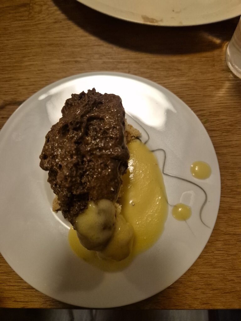 Es war richtig schön, dass jeder etwas mitgebracht hatte und sich die kulturelle Vielfalt auf unseren Tellern widerspiegelte – wobei ich auf die armen Elche wirklich hätte verzichten können! Die spanischen und italienischen Gerichte waren absolut traumhaft, genauso wie die Schoko-Mousse meiner Mitbewohnerin . Dazu ist anzumerken, dass ich die Schokolade dafür besorgte, denn sie hatte es den Tag vorher vergessen und ich musste eh noch einkaufen. Auch den Apfelkuchen konnte ich an dem Abend probieren – er war wunderbar zimtig, aber ein paar mehr Äpfel hätten sicher auch nicht geschadet;) .